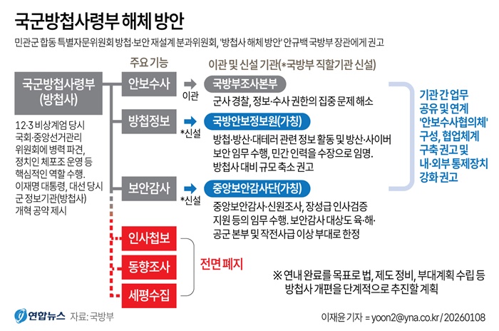 ÀÌ¿¡ ÀÌÀç¸í ´ëÅë·ÉÀº ÀÛ³â 6¿ù ´ë¼± ¶§ '±º Á¤º¸±â°ü(¹æÃ¸»ç) °³Çõ' °ø¾àÀ» Á¦½ÃÇß°í, ÀÌÀç¸í Á¤ºÎÀÇ ÀμöÀ§¿øÈ¸ ¿ªÇÒÀ» ÇÑ ±¹Á¤±âȹÀ§¿øÈ¸´Â ¹æÃ¸»ç¸¦ ÆóÁöÇϰí Çʼö ±â´ÉÀ» ºÐ»ê À̰üÇÒ °ÍÀ» °°Àº ÇØ 8¿ù ±Ç°íÇÑ ¹Ù ÀÖ´Ù.