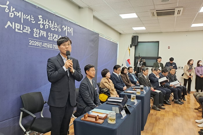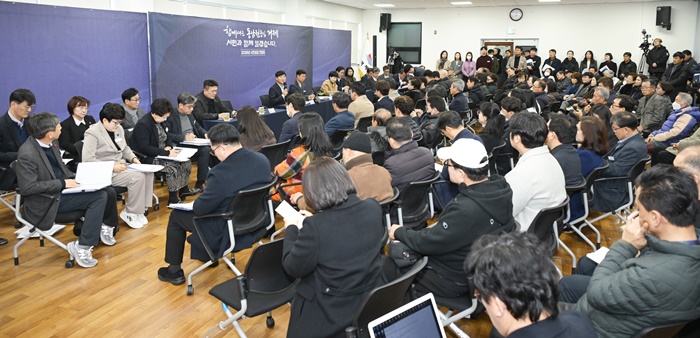 »ó¹®µ¿ Áֹμ¾ÅÍ¿¡¼ ¿ÀÀü 10½ÃºÎÅÍ ¿¹Á¤µÈ 1½Ã°£À» Èǽ ³Ñ°Ü 2½Ã°£ °¡±îÀÌ ÁøÇàµÈ ½Ã¹Î°ø°¨ °£´ãȸ´Â 2025³â ¼º°ú ¹× 2026³â ½ÃÁ¤ ¿î¿µ ¹æÇâ ¼³¸í, ½Ã¹Î°úÀÇ ´ëÈ ¼øÀ¸·Î ÁøÇàµÆ´Ù.