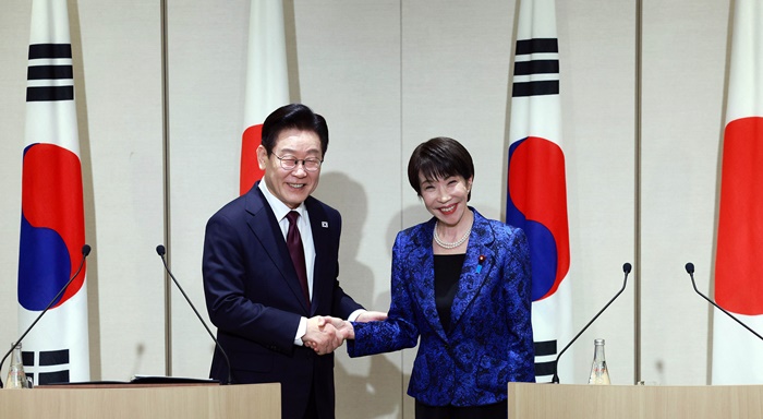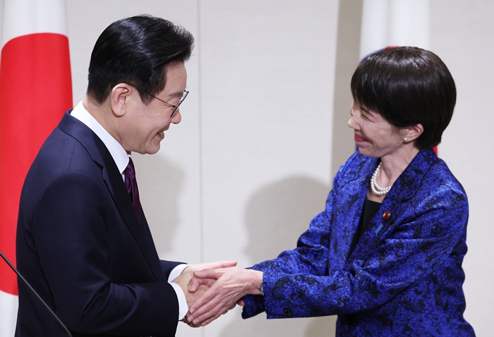 | ÀÌÀç¸í ´ëÅë·É°ú ´ÙÄ«ÀÌÄ¡ »ç³ª¿¡ ÀϺ» ÃѸ®°¡ 13ÀÏ ÀϺ» ³ª¶óÇö Á¤»óȸ´ãÀå¿¡¼ °øµ¿¾ð·Ð¹ßÇ¥ ÈÄ ¾Ç¼öÇϰí ÀÖ´Ù. /¿¬ÇÕ´º½º |