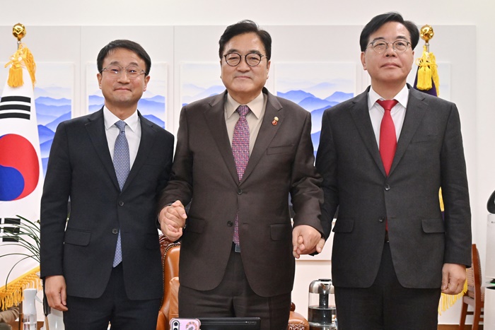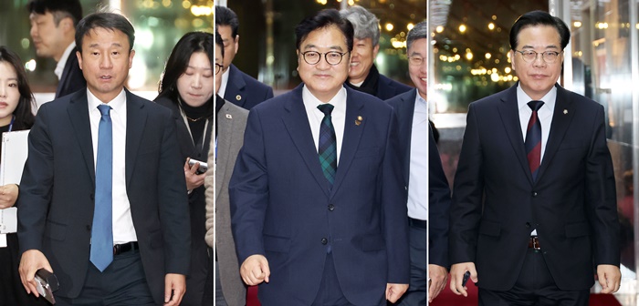 | ¿ì¿ø½Ä ±¹È¸ÀÇÀå(°¡¿îµ¥)°ú ´õºÒ¾î¹ÎÁÖ´ç ÇѺ´µµ ¿ø³»´ëÇ¥(¿ÞÂÊ), ±¹¹ÎÀÇÈû ¼Û¾ð¼® ¿ø³»´ëÇ¥°¡ Áö³ 14ÀÏ ±¹È¸ÀÇÀå½Ç¿¡¼ ¿¸° ±¹È¸ÀÇÀå-¾ç´ç ¿ø³»´ëÇ¥ ȸµ¿¿¡ Âü¼®ÇØ ±â³ä ÃÔ¿µÇϰí ÀÖ´Ù. /°øµ¿ÃëÀç |