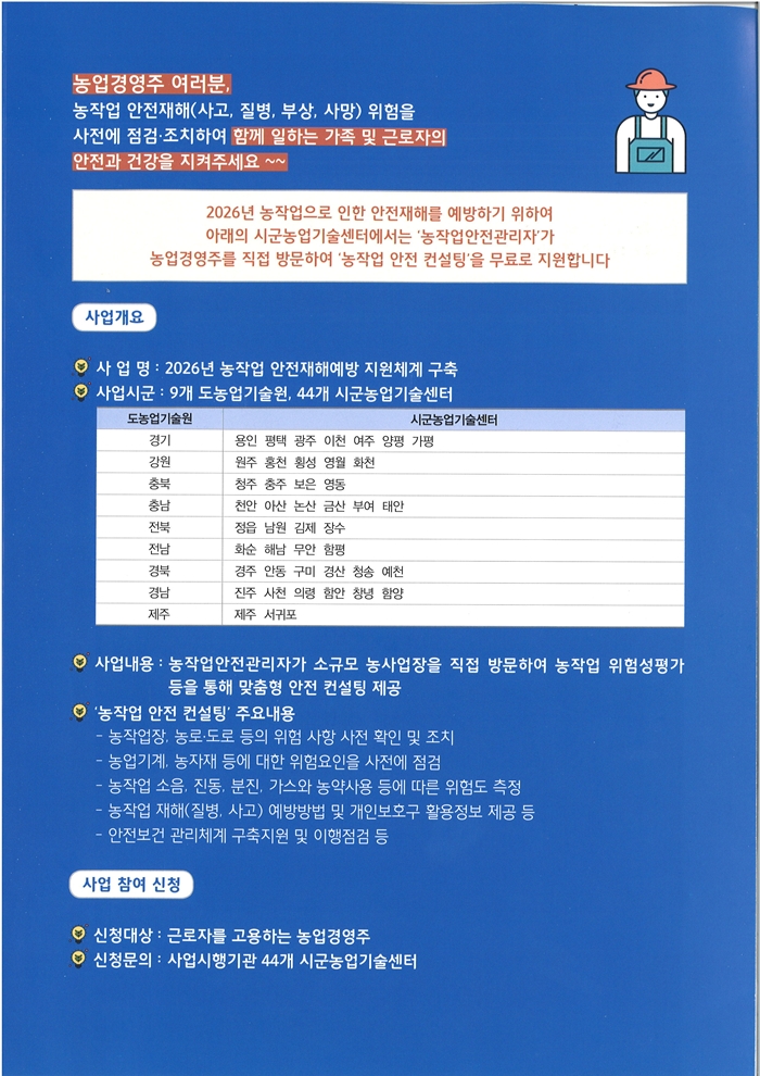 À̹ø »ç¾÷Àº ³óÀÛ¾÷¾ÈÀü°ü¸®ÀÚ°¡ ³ó¾÷°æ¿µÁÖ¸¦ Á÷Á¢ ¹æ¹®ÇØ, ³óÀÛ¾÷ ÇöÀåÀÇ À§Çè¿äÀÎÀ» Áø´ÜÇÏ°í ³ó°¡ ¿©°Ç¿¡ ¸Â´Â ¸ÂÃãÇü ¾ÈÀü°ü¸® ÄÁ¼³ÆÃÀ» Á¦°øÇÏ´Â »ç¾÷ÀÌ´Ù. 2¿ù±îÁö »ó½Ã ¸ðÁýÀ» ÅëÇØ ÃÑ 110³ó°¡¸¦ ¼±Á¤ÇÒ °èȹÀ̸ç, ÄÁ¼³ÆÃÀº 3¿ùºÎÅÍ 11¿ù±îÁö ÁøÇàµÈ´Ù. Âü¿© ºñ¿ëÀº Àü¾× ¹«·á·Î Áö¿øµÈ´Ù.