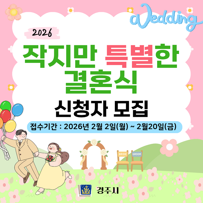 [½Ã»çÄÚ¸®¾ÆÀú³Î=°æºÏÃëÀ纻ºÎ] °æÁֽô ¿¹½Ä ºñ¿ë ºÎ´ãÀ» ÁÙÀ̰í ÀÇ¹Ì Áß½ÉÀÇ ¼Ò±Ô¸ð °áÈ¥¹®È¸¦ È®»êÇϱâ À§ÇØ ‘2026³â ÀÛÁö¸¸ Ưº°ÇÑ °áÈ¥½Ä’ Âü¿©ÀÚ¸¦ ¿À´Â 2¿ù 20ÀϱîÁö ¸ðÁýÇÑ´Ù°í 27ÀÏ ¹àÇû´Ù.
