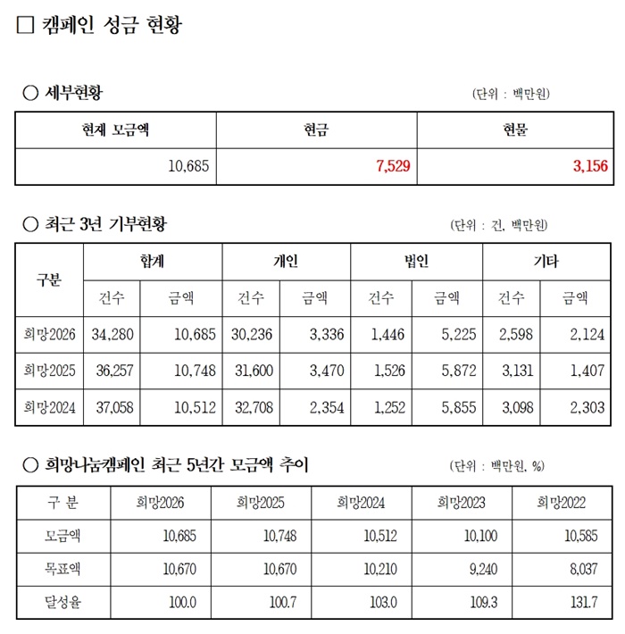 Èñ¸Á2026³ª´®Ä·ÆäÀÎÀº 2025³â 12¿ù 1ÀϺÎÅÍ 2026³â 1¿ù 31ÀϱîÁö ÃÑ 62Àϰ£ ‘ÇູÀ» ´õÇÏ´Â ±âºÎ, ±âºÎ·Î ¹Ù²Ù´Â °æ³²’À̶ó´Â ½½·Î°ÇÀ¸·Î ÁøÇàµÇ°í ÀÖÀ¸¸ç, Ä·ÆäÀÎ Á¾·á ÇϷ縦 ¾ÕµÎ°í ³ª´®¿Âµµ 100µµ, ±âºÎ±Ý 106¾ï 8õ¿©¸¸¿øÀ¸·Î ÀáÁ¤ Áý°èµÆ´Ù.