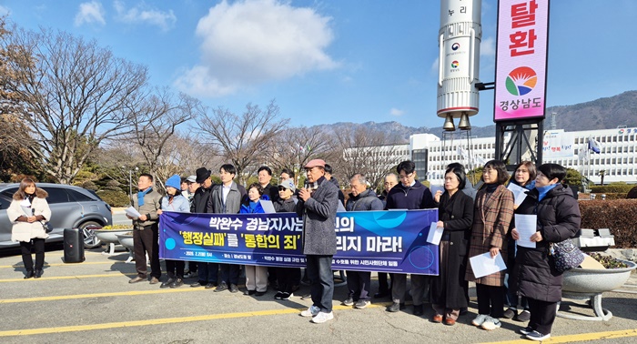 | '¹Ú¿Ï¼ö ÇàÁ¤½ÇÆÐ ±Ôź ¹× ºÎ¿ï°æ ÇàÁ¤ÅëÇÕ ¼öÈ£¸¦ À§ÇÑ ½Ã¹Î»çȸ´Üü'°¡ °æ³²µµÃ» ¾Õ¿¡¼ ±âÀÚȸ°ßÀ» Çϰí ÀÖ´Ù. |