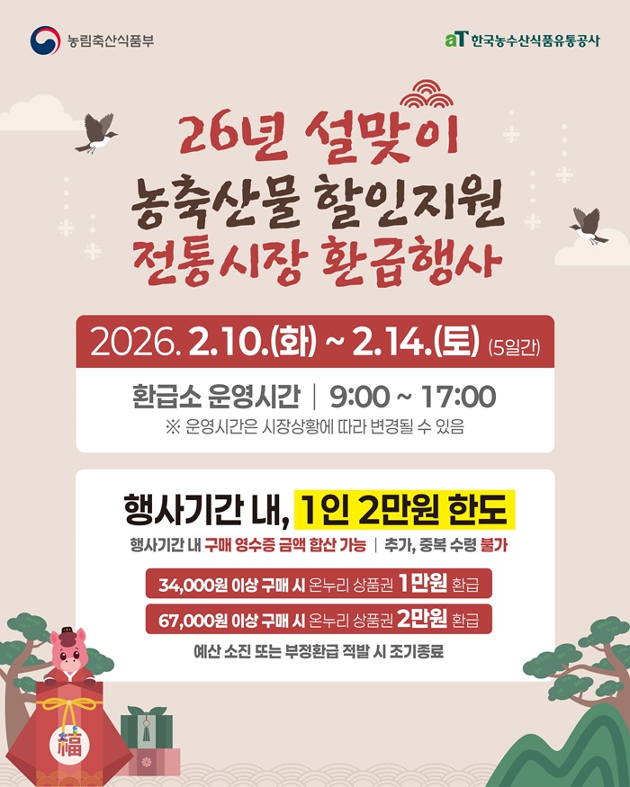 À̹ø Çà»ç´Â ³ó¸²Ãà»ê½ÄǰºÎ°¡ Áö¿øÇÏ´Â 2026³â ¼³¸ÂÀÌ ÀüÅë½ÃÀå ¼Òºñ ÃËÁø Ä·ÆäÀÎÀÇ ÀÏȯÀ¸·Î, ½Ã¹ÎÀÌ ÀüÅë½ÃÀå¿¡¼ ±¹»ê ³óÃà»ê¹°À» ±¸¸ÅÇÒ °æ¿ì ±¸¸Å ±Ý¾×ÀÇ ÀϺθ¦ ¿Â´©¸®»óǰ±ÇÀ¸·Î ȯ±ÞÇØÁÖ´Â ¹æ½ÄÀÌ´Ù.