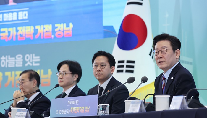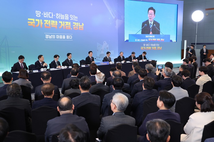 | ÀÌÀç¸í ´ëÅë·ÉÀÌ 6ÀÏ Ã¢¿ø ¼º»ê±¸ â¿øÄÁº¥¼Ç¼¾ÅÍ¿¡¼ ¿¸° '°æ³²ÀÇ ¸¶À½À» µè´Ù' Ÿ¿îȦ¹ÌÆÃ °£´ãȸ¿¡¼ ¹ß¾ðÇϰí ÀÖ´Ù. /¿¬ÇÕ´º½º |