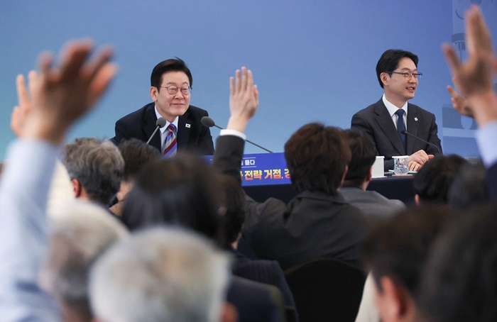 | ÀÌÀç¸í ´ëÅë·ÉÀÌ 6ÀÏ Ã¢¿ø ¼º»ê±¸ â¿øÄÁº¥¼Ç¼¾ÅÍ¿¡¼ ¿¸° '°æ³²ÀÇ ¸¶À½À» µè´Ù' Ÿ¿îȦ¹ÌÆÃ °£´ãȸ¿¡¼ Âü¼®ÀÚµéÀÇ ¹ß¾ð±Ç ¿äûÀ» ¹Þ°í ÀÖ´Ù. /¿¬ÇÕ´º½º |