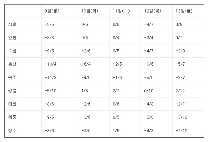±â»óû¿¡ µû¸£¸é ¿ù¿äÀÏÀÎ 9ÀÏ ¾ÆÄ§±îÁö ±â¿ÂÀÌ Æò³âº¸´Ù ³·¾Æ Ãä°ÚÀ¸³ª, ³·ºÎÅÍ Æò³â ±â¿ÂÀ» ȸº¹Çϸç ÃßÀ§°¡ ÇÑÇ® ²ªÀ̰ڴÙ.