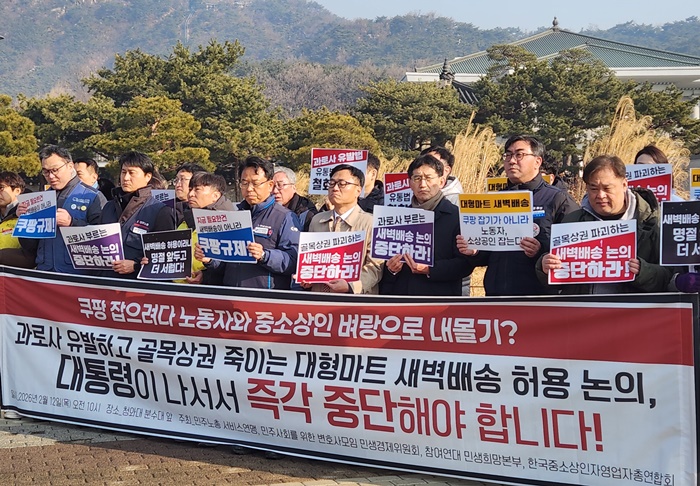 [½Ã»çÄÚ¸®¾ÆÀú³Î=±èÈñ¿µ ±âÀÚ] Á¤ºÎ¿Í ¿©´çÀÌ ´ëÇü¸¶Æ®ÀÇ '»õº® ¹è¼Û' Çã¿ëÀ» ÃßÁøÇÏÀÚ Áß¼Ò»óÀΰú ³ëµ¿·½Ã¹Î´Üü µîÀÌ "ÀÌÀç¸í ´ëÅë·ÉÀÌ ³ª¼¼ ³íÀǸ¦ Áï°¢ Áß´ÜÇØ¾ß ÇÑ´Ù"¸ç ¹Ý¹ßÇß´Ù.