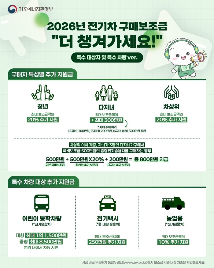 ¿ÃÇØ´Â ÀÌ·¯ÇÑ ¼ö¿ä¸¦ ¹Ý¿µÇØ »ç¾÷ ±Ô¸ð¸¦ Å©°Ô Ű¿ü´Ù. 2026³â Àü±âÀÚµ¿Â÷ º¸±ÞÁö¿ø »ç¾÷¿¡´Â Àü³â ´ëºñ ¾à 2¹è Áõ°¡ÇÑ 35¾ï¿øÀÇ ¿¹»êÀ» ÅõÀÔÇϸç, º¸±Þ ´ë¼ö´Â ÃÑ 302´ë(½Â¿ëÂ÷ 170´ë, ȹ°Â÷ 100´ë, ÀÌ·ûÂ÷ 30´ë, ¹ö½º 2´ë µî)·Î ´ëÆø ´Ã¾î³µ´Ù.