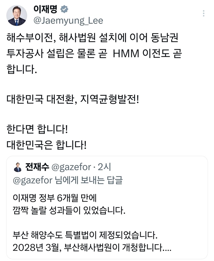 [½Ã»çÄÚ¸®¾ÆÀú³Î=Á¤Á¾¹Î ¼±ÀÓ±âÀÚ] ÀÌÀç¸í ´ëÅë·ÉÀº 19ÀÏ "ÇØ¼öºÎ ÀÌÀü, ÇØ»ç¹ý¿ø ¼³Ä¡¿¡ ÀÌ¾î µ¿³²±Ç ÅõÀÚ°ø»ç ¼³¸³Àº ¹°·Ð HMM ÀÌÀüµµ °ð ÇϰڴÙ"°í ¹àÇû´Ù.