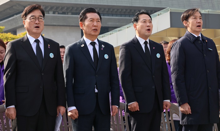 | Áö³ÇØ 10¿ù 29ÀÏ ¼¿ï Á¾·Î±¸ ±¤È¹® ±¤Àå¿¡¼ ¿¸° ÀÌÅ¿ø Âü»ç 3Áֱ⠱â¾ï½Ä¿¡¼ ¿ì¿ø½Ä ±¹È¸ÀÇÀå(¿ÞÂʺÎÅÍ)°ú ´õºÒ¾î¹ÎÁÖ´ç Á¤Ã»·¡ ´ëÇ¥, ±¹¹ÎÀÇÈû À嵿Çõ ´ëÇ¥, Á¶±¹Çõ½Å´ç Á¶±¹ ´ëÇ¥°¡ ¾Ö±¹°¡¸¦ Á¦Ã¢Çϰí ÀÖ´Ù. /¿¬ÇÕ´º½º ÀÚ·á»çÁø |
