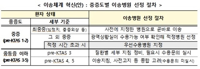 À̼Ûü°è Çõ½Å¾È¿¡ µû¶ó 119±¸±Þ´ë´Â ÁßÁõȯÀÚ(pre-KTAS 1∼2µî±Þ) Á¤º¸¸¦ ±¤¿ª»óȲ½Ç°ú 119±¸±Þ»óȲ°ü¸®¼¾ÅÍ¿¡ ½Ç½Ã°£À¸·Î Á¤º¸¸¦ °øÀ¯ÇÑ´Ù. ÇÁ¸®-ÄÉÀÌŸ½º(pre-KTAS)´Â Çѱ¹Çü º´¿ø Àü ÀÀ±ÞȯÀÚ ºÐ·ù µµ±¸¸¦ ¶æÇÑ´Ù.