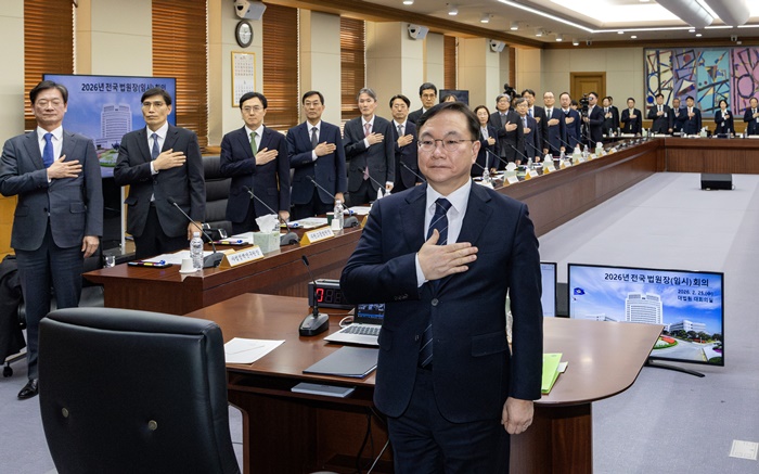 ¹Ú¿µÀç ¹ý¿øÇàÁ¤Ã³Àå(´ë¹ý°ü)°ú Àü±¹ °¢±Þ ¹ý¿øÀåµéÀº À̳¯ ¿ÀÈÄ ¼Ãʵ¿ ´ë¹ý¿ø û»ç ´ëȸÀǽǿ¡¼ Àü±¹¹ý¿øÀåȸÀÇ ÀÓ½ÃȸÀǸ¦ ¿°í À̰°Àº °ø½Ä ÀÔÀåÀ» ³»³õ¾Ò´Ù. À̳¯ ÀÓ½ÃȸÀÇ´Â ¿ÀÈÄ 2½ÃºÎÅÍ 6½Ã 40ºÐ±îÁö ÁøÇàµÆ´Ù. ¹Ú óÀåÀ» Æ÷ÇÔÇØ ÃÑ 43¸íÀÌ Âü¼®Çß´Ù.