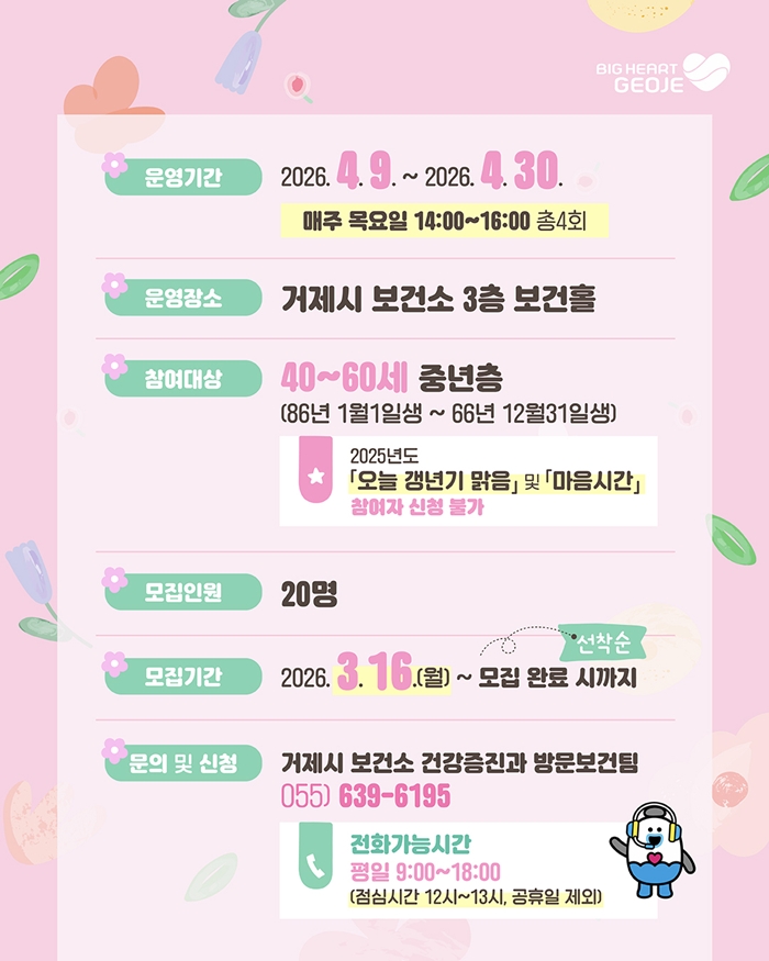 [½Ã»çÄÚ¸®¾ÆÀú³Î=Á¤Á¾¹Î ¼±ÀÓ±âÀÚ] °ÅÁ¦½Ãº¸°Ç¼Ò(¼ÒÀå ±è¿µ½Ç)´Â ¿À´Â 4¿ù 9ÀÏ, 40¼¼~60¼¼(1996³â 1¿ù 1ÀÏ»ý~1986³â 12¿ù 31ÀÏ»ý) Áß³âÃþ 20¸íÀ» ´ë»óÀ¸·Î '´Ù½Ã º½, °»³â±â ÇѹæÄɾî' ÇÑÀÇ¾à °Ç°ÁõÁø»ç¾÷ ÇÁ·Î±×·¥À» ¿î¿µÇÑ´Ù°í ¹àÇû´Ù.