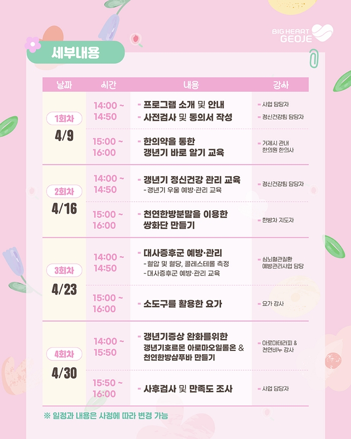 ÇÁ·Î±×·¥Àº 4¿ù 9ÀϺÎÅÍ ¸ÅÁÖ ¸ñ¿äÀÏ ¿ÀÈÄ 2½ÃºÎÅÍ 4½Ã±îÁö ÃÑ 4ȸ¿¡ °ÉÃÄ º¸°Ç¼Ò 3Ãþ º¸°ÇȦ¿¡¼ ¿î¿µµÈ´Ù.