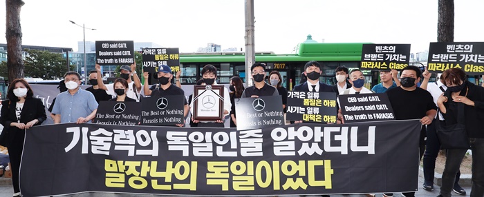 | 2024³â 9¿ù 27ÀÏ 'º¥Ã÷ EQ ÆÄ¶ó½Ã½º ±â¸ÁÆÇ¸Å ºñ»ó´ëÃ¥À§¿øÈ¸' °ü°èÀÚµéÀÌ 27ÀÏ ¿ÀÈÄ ¸Þ¸£¼¼µ¥½º-º¥Ã÷ ÄÚ¸®¾Æ º»»ç°¡ ÀÔÁÖÇÑ ¼¿ï Áß±¸ ¼¿ï½ºÄù¾î ¾Õ¿¡¼ º¥Ã÷°¡ ÀϺΠEQE Àü±âÂ÷¿¡ Áß±¹ ÆÄ¶ó½Ã½º ¹èÅ͸®¸¦ žÀçÇØ³õ°í ¼ÒºñÀڵ鿡°Ô´Â CATL ¹èÅ͸®¸¦ ÀåÂøÇß´Ù°í ¾Ë·È´Ù¸ç À̸¦ ±ÔźÇϰí ÀÖ´Ù. /¿¬ÇÕ´º½º ÀÚ·á»çÁø |