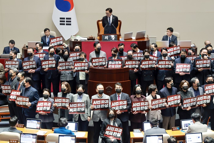 | ±¹¹ÎÀÇÈû ÀÇ¿øµéÀÌ 28ÀÏ ±¹È¸¿¡¼ ¿¸° 2¿ù Àӽñ¹È¸ 8Â÷ º»È¸ÀÇ¿¡¼ Àü³¯ »óÁ¤µÈ ¹ý¿øÁ¶Á÷¹ý °³Á¤¾È(´ë¹ý°ü Áõ¿ø¹ý)¿¡ ´ëÇÑ ¹«Á¦ÇÑ Åä·Ð Á¾°á µ¿ÀÇÀÇ °Ç ÅõÇ¥°¡ ½ÃÀÛµÈ µÚ »ç¹ý°³Çõ 3¹ý(¹ý¿Ö°îÁË·ÀçÆÇ¼Ò¿øÁ¦·´ë¹ý°ü Áõ¿ø) ±Ôź ½ÃÀ§¸¦ Çϰí ÀÖ´Ù. /¿¬ÇÕ´º½º |