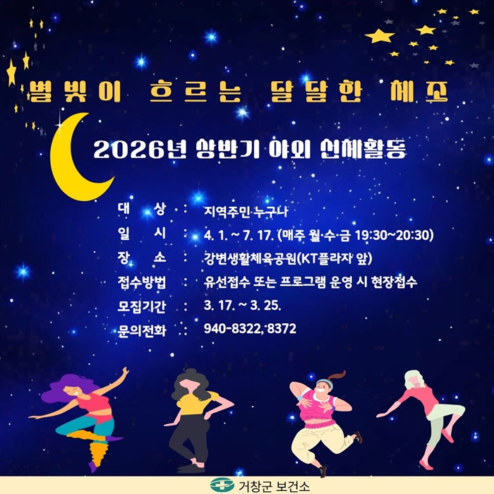 [½Ã»çÄÚ¸®¾ÆÀú³Î=Á¤Á¾¹Î ¼±ÀÓ±âÀÚ] °ÅⱺÀº Áö¿ªÁÖ¹ÎÀÇ ½ÅüȰµ¿ ½ÇõÀ» µ½°í °Ç°ÇÑ »ýȰ½À°ü Çü¼ºÀ» À§ÇØ ¿À´Â 4¿ù 1ÀϺÎÅÍ 7¿ù 17ÀϱîÁö ¾ß°£ ¾ß¿ÜüÁ¶ ÇÁ·Î±×·¥ ‘º°ºûÀÌ È帣´Â ´Þ´ÞÇÑ Ã¼Á¶’¸¦ ¿î¿µÇÑ´Ù.