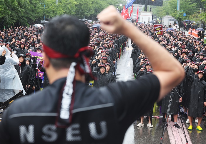 | Áö³ 2024³â 7¿ù 8ÀÏ ¿ÀÀü °æ±âµµ ȼº½Ã »ï¼ºÀüÀÚ È¼º»ç¾÷Àå ¾Õ¿¡¼ ¿¸° Àü±¹»ï¼ºÀüÀڳ뵿Á¶ÇÕ ÃÑÆÄ¾÷ °áÀÇ´ëȸ¿¡¼ Á¶ÇÕ¿øµéÀÌ ±¸È£¸¦ ¿ÜÄ¡°í ÀÖ´Ù. /¿¬ÇÕ´º½º ÀÚ·á»çÁø |