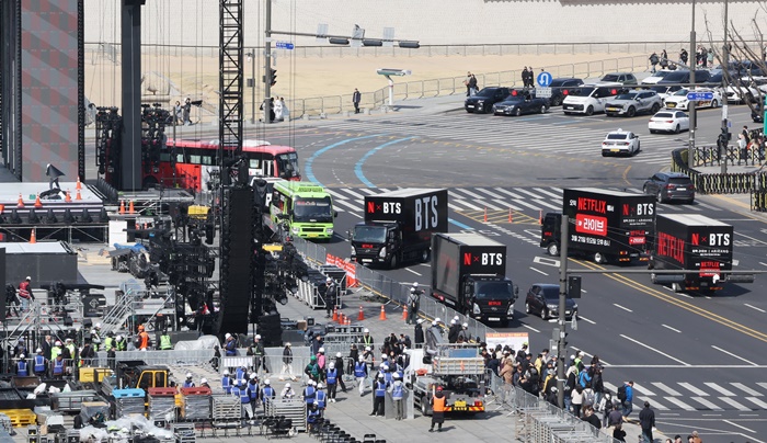 | ±×·ì ¹æÅº¼Ò³â´Ü(BTS)ÀÇ ±¤È¹® °ø¿¬À» ¾ÕµÐ 19ÀÏ ¼¿ï ±¤È¹®±¤Àå¿¡¼ °ø¿¬ ÁغñÀÛ¾÷ÀÌ ÀÌ·ïÁö°í ÀÖ´Ù. /¿¬ÇÕ´º½º |