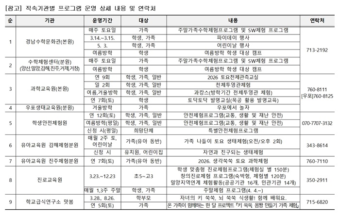 °¢ ±â°üº° »ó¼¼ÇÑ ÁÖ¸» üÇèÇÁ·Î±×·¥ ³»¿ë°ú ½Åû ¹æ¹ýÀº ÇØ´ç ±â°ü ´©¸®Áý ¶Ç´Â ‘°æ»ó³²µµ±³À°Ã» ÅëÇÕ¿¹¾àÆ÷ÅÐ(service.gne.go.kr/yeyak)’¿¡¼ È®ÀÎÇÒ ¼ö ÀÖ´Ù.