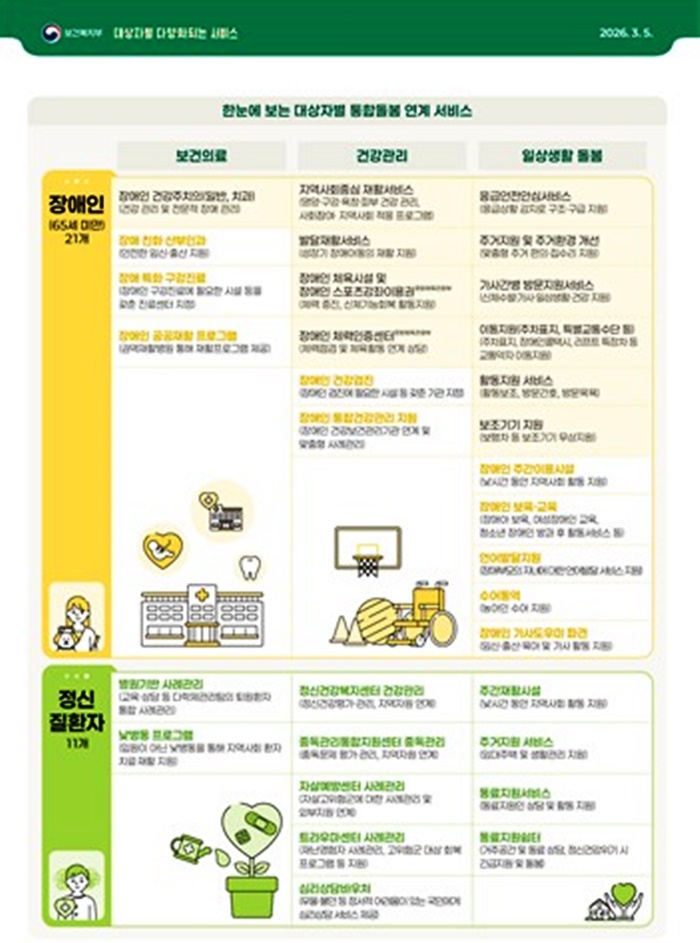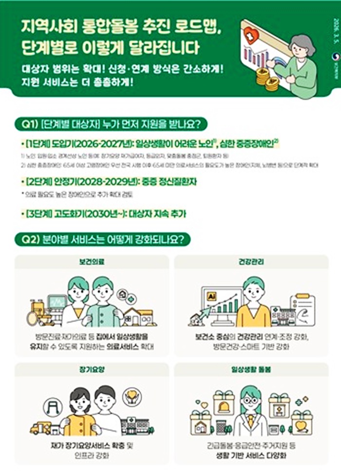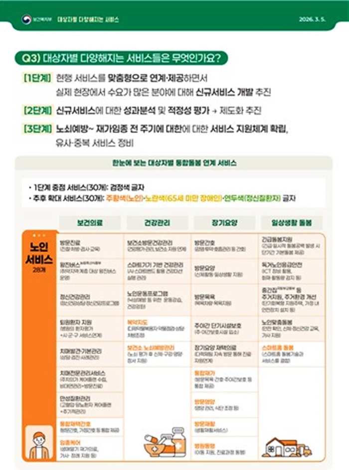 ƯÈ÷ 65¼¼ ÀÌ»ó Àç°¡±Þ¿©ÀÚ³ª Àå±â¿ä¾ç µî±Þ¿ÜÀÚ, Åð¿ø È¯ÀÚ µîÀÌ ÁÖ¿ä ´ë»óÀÌ´Ù. ÀÌÈÄ 2028³âºÎÅÍ´Â Á¤½ÅÁúȯÀÚ·Î ´ë»óÀ» È®´ëÇϰí 2030³â¿¡´Â µ¹º½ Çʿ䵵°¡ ³ôÀº ¸ðµç ±¹¹ÎÀ» ¾Æ¿ì¸£´Â Àü ÁÖ±â Áö¿ø ü°è¸¦ ±¸ÃàÇÑ´Ù.