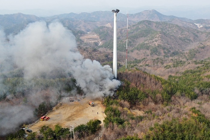 [½Ã»çÄÚ¸®¾ÆÀú³Î=±è¿¬ÇÐ ±âÀÚ] 3ÀÏ Àü ºÒÀÌ ³ °æºÏ ¿µ´ö dz·Â¹ßÀü±â¿¡¼ ÀܺÒÀÌ ºÙÀº ä ³²¾Æ ÀÖ´ø ¸¶Áö¸· ºí·¹À̵å(³¯°³)°¡ º»Ã¼¿¡¼ ¶³¾îÁ® ¶¥À¸·Î Ãß¶ôÇß´Ù.