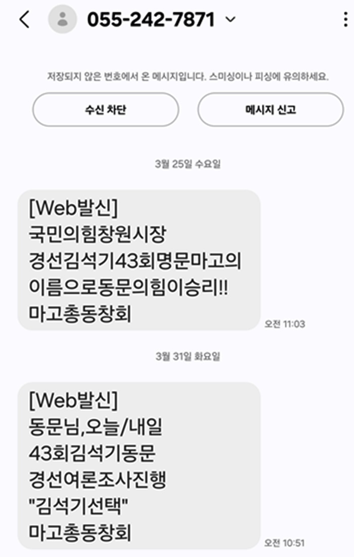 °í¹ßÀå¿¡ µû¸£¸é ¸¶»ê°íµîÇб³ Ãѵ¿Ã¢È¸´Â °øÁ÷¼±°Å¹ý»ó ¼±°Å¿îµ¿ÀÌ ±ÝÁöµÈ ´ÜüÀÓ¿¡µµ, ¿À´Â 6¿ù 3ÀÏ ½Ç½ÃµÇ´Â Áö¹æ¼±°Å â¿ø½ÃÀå ±¹¹ÎÀÇÈû °æ¼±°ú °ü·ÃÇØ Áö³ 3¿ù 25ÀÏ ¿ÀÀü '±¹¹ÎÀÇÈû â¿ø½ÃÀå °æ¼± ±è¼®±â43ȸ ¸í¹®¸¶°íÀÇ À̸§À¸·Î µ¿¹®ÀÇÈûÀÌ ½Â¸®!!'¶ó´Â ¹®ÀÚ¸Þ½ÃÁö¸¦ ¸¶°íÃѵ¿Ã¢È¸ ¸íÀÇ·Î ÀÛ¼ºÇØ µ¿¹® ´Ù¼ö¿¡°Ô ¹ß¼ÛÇß´Ù´Â °ÍÀÌ´Ù.