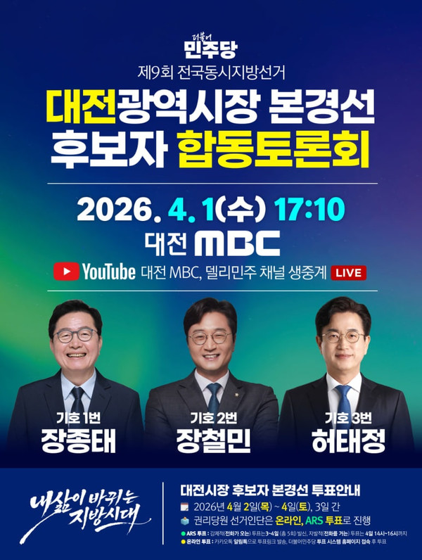 1ÀÏ ´ëÀüMBC¿¡¼ ¿¸° ´ëÀü½ÃÀå º»°æ¼± Èĺ¸ÀÚ ÇÕµ¿Åä·Ðȸ¿¡´Â ÇãÅÂÁ¤ Àü ´ëÀü½ÃÀå, ÀåÁ¾Å ±¹È¸ÀÇ¿ø(¼±¸), Àåö¹Î ±¹È¸ÀÇ¿ø(µ¿±¸)ÀÌ ºÐ¾ßº° Ä¡¿ÇÑ ³íÀïÀ» ÆîÃÆ´Ù.