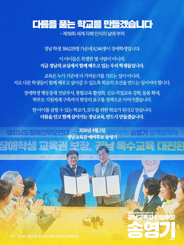 [½Ã»çÄÚ¸®¾ÆÀú³Î=Á¤Á¾¹Î ¼±ÀÓ±âÀÚ] ¼Û¿µ±â °æ³²±³À°°¨ ¿¹ºñÈ帰¡ 2ÀÏ Á¦18ȸ ¼¼°è ÀÚÆó ÀνÄÀÇ ³¯À» ¸Â¾Æ "´Ù¸§À» ¾È°í ÇÔ²² »ì¾Æ°¡´Â °æ³²±³À°À» ¹Ýµå½Ã ¸¸µé°Ú´Ù"¸ç Àå¾ÖÇлý ±³À°±Ç º¸Àå°ú ÅëÇÕ±³À° ½ÇÇö ÀÇÁö¸¦ ´ãÀº ³íÆòÀ» ¹ßÇ¥Çß´Ù.