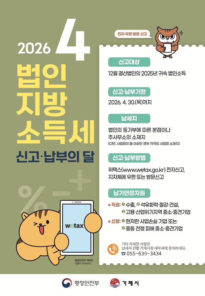[½Ã»çÄÚ¸®¾ÆÀú³Î=Á¤Á¾¹Î ¼±ÀÓ±âÀÚ] °ÅÁ¦½Ã´Â 2025³â 12¿ù °á»ê ¹ýÀÎÀ» ´ë»óÀ¸·Î 4¿ù 1ÀϺÎÅÍ 30ÀϱîÁö ÇÑ ´Þ°£ ‘2026³â ¹ýÀÎÁö¹æ¼Òµæ¼¼ ÁýÁß ½Å°í·³³ºÎ ±â°£’À» ¿î¿µÇÑ´Ù°í ¹àÇû´Ù.