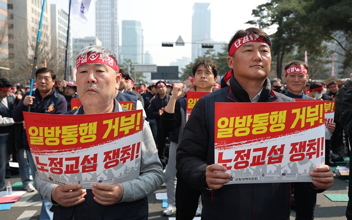 | ±èµ¿¸í Çѱ¹³ëµ¿Á¶ÇÕÃÑ¿¬¸Í À§¿øÀå(¿ÞÂÊ)°ú ¾ç°æ¼ö ¹ÎÁֳ뵿Á¶ÇÕÃÑ¿¬¸Í À§¿øÀåÀÌ 17ÀÏ ¼¿ï ¿µµîÆ÷±¸ ±¹È¸ Àαٿ¡¼ ¿¸° '°ø°øºÎ¹® ³ëÁ¤±³¼· ½ÇÇöÀ» À§ÇÑ ¾ç´ë³ëÃÑ °ø°øºÎ¹®³ëµ¿Á¶ÇÕ ÅõÀï°áÀÇ´ëȸ'¿¡¼ ¼ÕÆÖ¸»À» µé°í ÀÖ´Ù. /¿¬ÇÕ´º½º |
