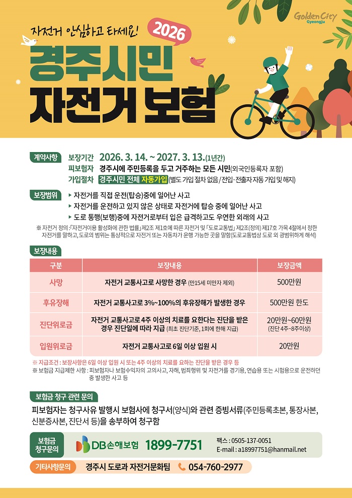 [½Ã»çÄÚ¸®¾ÆÀú³Î=°æºÏÃëÀ纻ºÎ] °æÁֽô ½Ã¹ÎµéÀÌ ¾È½ÉÇϰí ÀÚÀü°Å¸¦ ÀÌ¿ëÇÒ ¼ö ÀÖµµ·Ï ‘°æÁֽùΠÀÚÀü°Åº¸Çè’À» Àç°¡ÀÔÇß´Ù°í 8ÀÏ ¹àÇû´Ù. º¸Çè Àû¿ë ±â°£Àº ³»³â 3¿ù 13ÀϱîÁö´Ù.