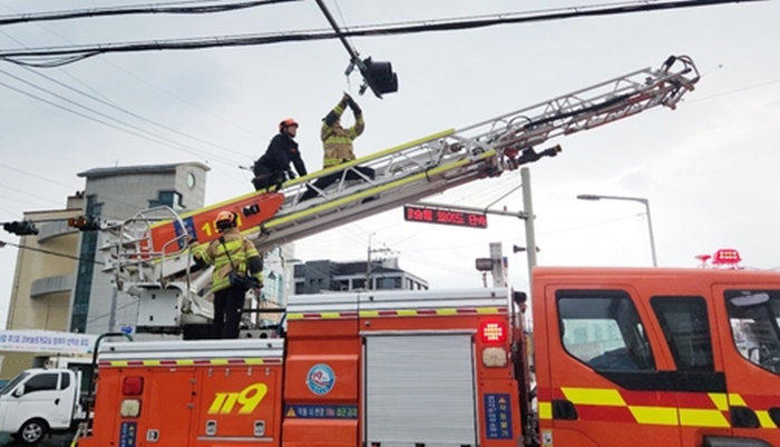 | °Ç³¿¡ ¶³¾îÁø µµ·Î ½ÅÈ£±â ¾ÈÀüÁ¶Ä¡ ÇÏ´Â 119 ¼Ò¹æ´ë¿øµé /Á¦ÁÖµµ¼Ò¹æ¾ÈÀüº»ºÎ Á¦°ø |