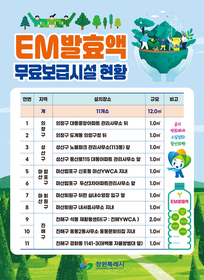 â¿ø½Ã´Â ½Ã¹ÎµéÀÇ Á¢±Ù¼ºÀ» °í·ÁÇÏ¿©, ÀÇⱸ 2°³¼Ò, ¼º»ê±¸ 2°³¼Ò, ¸¶»êÇÕÆ÷±¸ 2°³¼Ò, ¸¶»êȸ¿ø±¸ 2°³¼Ò, ÁøÇر¸ 3°³¼Ò ÃÑ 11°³¼ÒÀÇ EM¹ßÈ¿¾× ¹«·áº¸±Þ½Ã¼³À» ¼³Ä¡·¿î¿µÇϰí ÀÖÀ¸¸ç, ¸Å¿ù 5ÀÏ EM¹ßÈ¿¾×À» Á¦°øÇϰí ÀÖ´Ù. ´Ù¸¸, ÈÞÀÏÀ̳ª °øÈÞÀÏ µîÀÇ »çÁ¤¿¡ µû¶ó °ø±ÞÀÏÀÌ ÀϺΠÁ¶Á¤µÉ ¼ö ÀÖ´Ù.