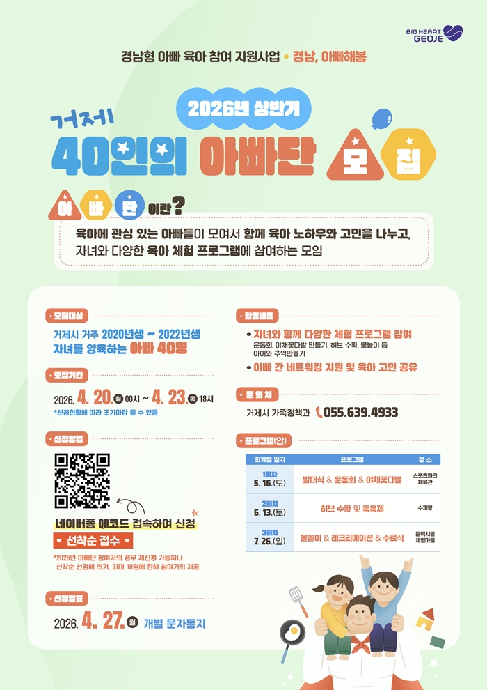 [½Ã»çÄÚ¸®¾ÆÀú³Î=Á¤Á¾¹Î ¼±ÀÓ±âÀÚ] °ÅÁ¦½Ã´Â ¾ÆºüÀÇ Àû±ØÀûÀÎ À°¾Æ Âü¿©¸¦ À¯µµÇϰí, °¡Á·Áß½ÉÀÇ °Ç°ÇÑ ¾çÀ°¹®È¸¦ È®»êÇϱâ À§ÇØ 2026³â »ó¹Ý±â '°ÅÁ¦ 40ÀÎÀÇ ¾Æºü´Ü'À» ¸ðÁýÇÑ´Ù.