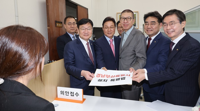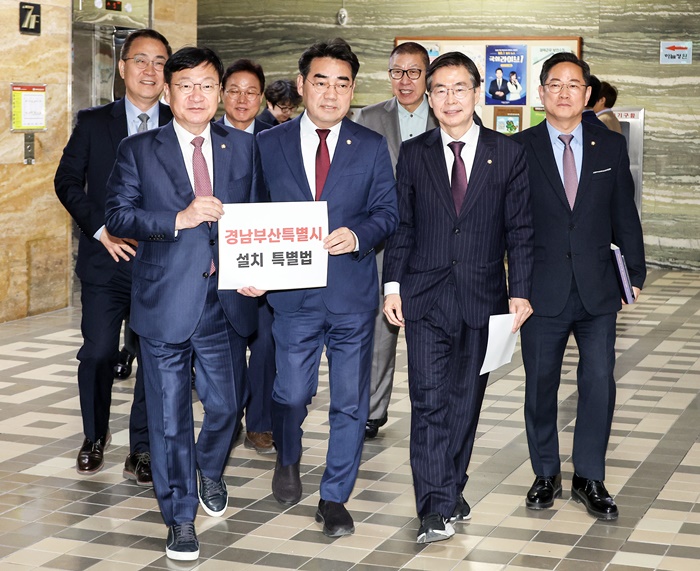 | ±¹¹ÎÀÇÈû ÀÇ¿øµéÀÌ 14ÀÏ ±¹È¸ ÀǾȰú¿¡ '°æ³²ºÎ»êƯº°½Ã ¼³Ä¡ Ưº°¹ý'À» Á¦ÃâÇϱâ À§ÇØ ÀÔÀåÇϰí ÀÖ´Ù. ¿ÞÂʺÎÅÍ ÃÖÇüµÎ ÀÇ¿ø, Á¤Á¡½Ä Á¤Ã¥À§ÀÇÀå, ¹Ú¿Ï¼ö °æ³²µµÁö»ç, À̼º±Ç ºÎ»ê½Ã´çÀ§¿øÀå, ¹ÚÇüÁØ ºÎ»ê½ÃÀå, Á¶°æÅ ÀÇ¿ø, ¹Ú¼ö¿µ ÀÇ¿ø. |