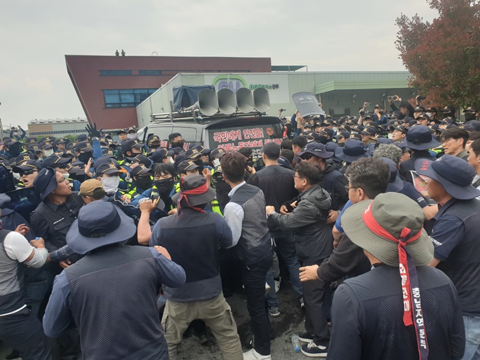 °æ³²°æÂûû µî¿¡ µû¸£¸é À̳¯ ¿ÀÈÄ 1½Ã 33ºÐ²² ȹ°¿¬´ë Áýȸ ÇöÀå¿¡¼ ³ëÁ¶ Ãø Â÷·®ÀÌ ¹æÆÐ¸¦ µé°í ÀÖ´Â °æÂû °æ·Â ¹Ù¸®ÄÉÀ̵带 Ä£ µÚ ¼¾ÅÍ Á¤¹®À¸·Î µ¹ÁøÇß´Ù.