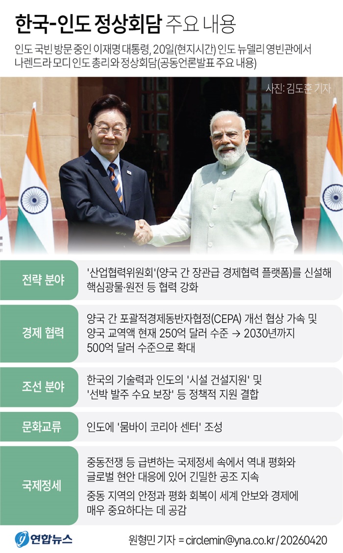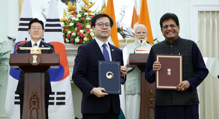 | ±èÁ¤°ü »ê¾÷Åë»óºÎ Àå°ü°ú ÇÇÀ¯½Ã °í¾â Àεµ »ó°øºÎ Àå°üÀÌ 20ÀÏ(ÇöÁö½Ã°£) Àεµ ´ºµ¨¸® ¿µºó°ü¿¡¼ ÀÌÀç¸í ´ëÅë·É°ú ³ª·»µå¶ó ¸ðµð ÃѸ®°¡ ÀÓ¼®ÇÑ °¡¿îµ¥ »ê¾÷Çù·ÂÀ§¿øÈ¸ ½Å¼³ ¾çÇØ°¢¼(MOU) ±³È¯ ÈÄ ±â³äÃÔ¿µÀ» Çϰí ÀÖ´Ù. /¿¬ÇÕ´º½º |