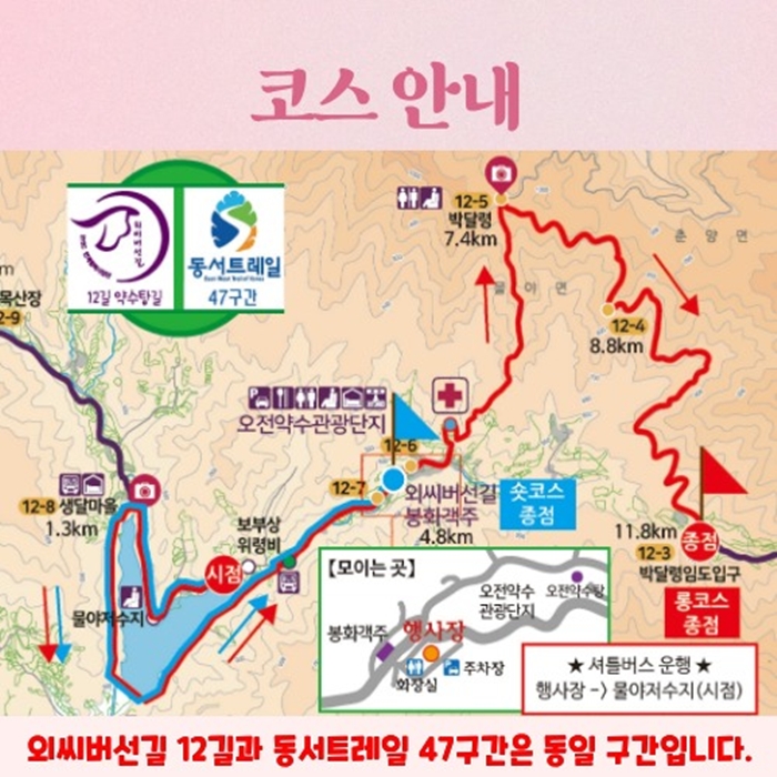 µÑ° ³¯ÀÎ 6¿ù 6ÀÏ(Åä)¿¡´Â Åå ½î´Â ź»ê ¾à¼ö·Î À̸§³ ¿ÀÀü¾à¼öÅÁÀ» Áö³ª´Â ‘¾à¼öÅÁ±æ(12±æ)’ Èú¸µ ÄÚ½º°¡ À̾îÁø´Ù. °¡Á· ´ÜÀ§ Âü°¡ÀÚ¸¦ °í·ÁÇØ ¡ã¼ôÄÚ½º(4.8km)¿Í ¡ã·ÕÄÚ½º(11.8km)·Î ³ª´©¾î ¿î¿µÇϸç, ÄÚ½º´ç °¢°¢ 250¸í¾¿ ÃÑ 500¸íÀ» ¼±Âø¼ø ¸ðÁýÇÒ °èȹÀÌ´Ù.