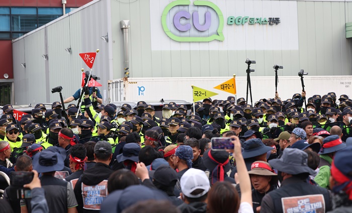 | Áö³ 20ÀÏ ¿ÀÈÄ °æ³² ÁøÁֽà Á¤Ã̸é BGF·ÎÁö½º ÁøÁÖ¼¾ÅÍ¿¡¼ ȹ°¿¬´ë °ü°èÀÚ°¡ ¼¾ÅÍ ÀÔ±¸·Î ÁøÀÔÇÏ·Á´Â °úÁ¤¿¡¼ °æÂû°ú ´ëÄ¡Çϰí ÀÖ´Ù. /¿¬ÇÕ´º½º |