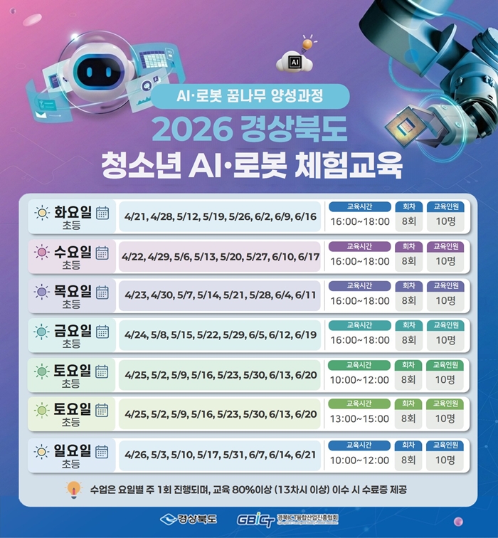 À̹ø »ç¾÷Àº AI¿Í ·Îº¿ ±â¼úÀÌ Àü »ê¾÷À¸·Î È®»êµÇ´Â ´ëÀüȯ(AX) ½Ã´ë¿¡ ´ëÀÀÇØ, »ó´ëÀûÀ¸·Î ±³À° ÀÎÇÁ¶ó°¡ ºÎÁ·ÇÑ °æºÏ ºÏºÎ±Ç û¼Ò³âµé¿¡°Ô ¼öÁØ ³ôÀº ½Ç½ÀÇü ±³À° ±âȸ¸¦ Á¦°øÇϱâ À§ÇØ ¸¶·ÃµÆ´Ù. ±³À° ´ë»óÀº µµ³» ºÏºÎ±Ç ÃÊµî °íÇгâ°ú ÁßÇлýÀ¸·Î ¿ÃÇØ ¿¬¸»±îÁö ¾à 1,000¸íÀ» ´ë»óÀ¸·Î ¿Â․¿ÀÇÁ¶óÀÎ ±³À°À» ½Ç½ÃÇÒ °èȹÀÌ´Ù.
