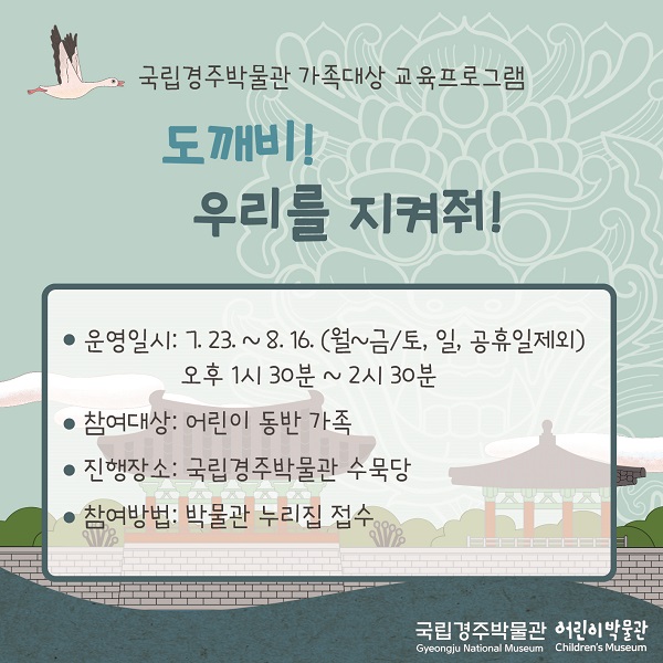 ‘µµ±úºñ! ¿ì¸®¸¦ ÁöÄÑÁà!'ÀÇ ¿î¿µ±â°£Àº ¿À´Â 7¿ù 23ÀÏ È¿äÀϺÎÅÍ 8¿ù 16ÀÏ ±Ý¿äÀϱîÁö ¿ÀÈÄ 1½Ã 30ºÐºÎÅÍ 1½Ã°£ µ¿¾È ÁøÇàÇÑ´Ù. ½ÅûÀº ±¹¸³°æÁÖ¹Ú¹°°ü ´©¸®Áý(http://gyeongju.museum.go.kr/)‘±³À°‧Çà»ç ±³À°ÇÁ·Î±×·¥’¿¡¼ ÇÒ ¼ö ÀÖ´Ù.