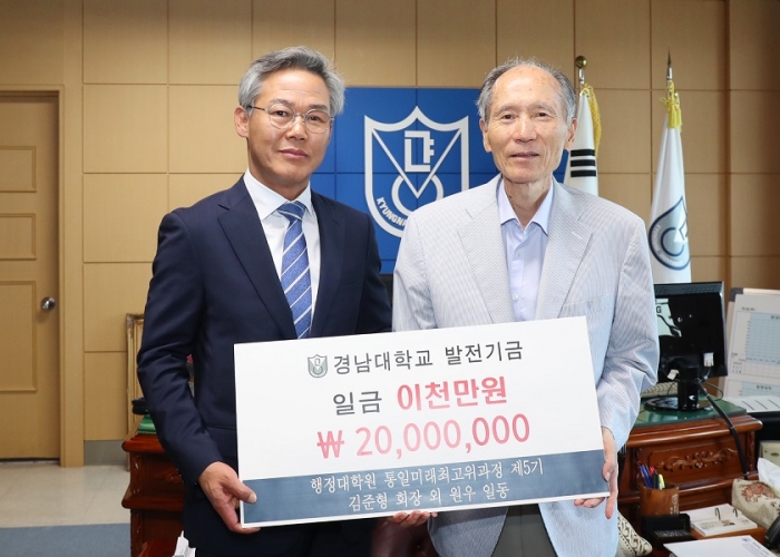 [½Ã»çÄÚ¸®¾ÆÀú³Î ±èÈñ¿µ ±âÀÚ] °æ³²´ëÇб³ ÇàÁ¤´ëÇпø(¿øÀå ±èÁöȯ) ÅëÀϹ̷¡ÃÖ°íÀ§°úÁ¤ 5±â Çлýȸ(ȸÀå ±èÁØÇü)´Â 7ÀÏ ¿ÀÈÄ 1½Ã 40ºÐ ¸ð±³ÀÇ ´ëÇйßÀü±â±ÝÀ¸·Î 2,000¸¸ ¿øÀ» ÄèôÇß´Ù.