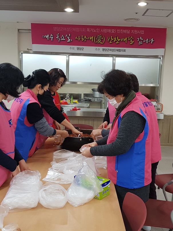 »ç¶û¾Ö(äñ) ¹ÝÂù¹è´Þ Áö¿ø»ç¾÷Àº ¿µ¾ç±ºÀÌ ÁÖ°üÇÏ°í ¿µ¾ç±º¿©¼º´ÜüÇùÀÇȸ ¼Ò¼Ó 12°³ ´Üü°¡ ÁÖÃàÀÌ µÇ¾î ¿¬Áß ÃßÁøÇÏ´Â »ç¾÷À¸·Î, ¸ÅÁÖ ¸ñ¿äÀÏ 10¿©¸íÀÇ ¿©¼º´ÜüÇùÀÇȸ ȸ¿øµéÀÌ º¹Áöȸ°ü Á¶¸®½Ç¿¡¼ Á÷Á¢ Á¶¸®¸¦ Çϰí, 24¸íÀÇ ¹è´Þ ÀÚ¿øºÀ»çÀÚ°¡ °¡Á¤¸¶´Ù »ç¶û¾Ö(äñ) ¹ÝÂùÀ» ¹è´ÞÇϸç ÀÌ¿ô»ç¶ûÀ» ½ÇõÇϰí ÀÖ´Ù.