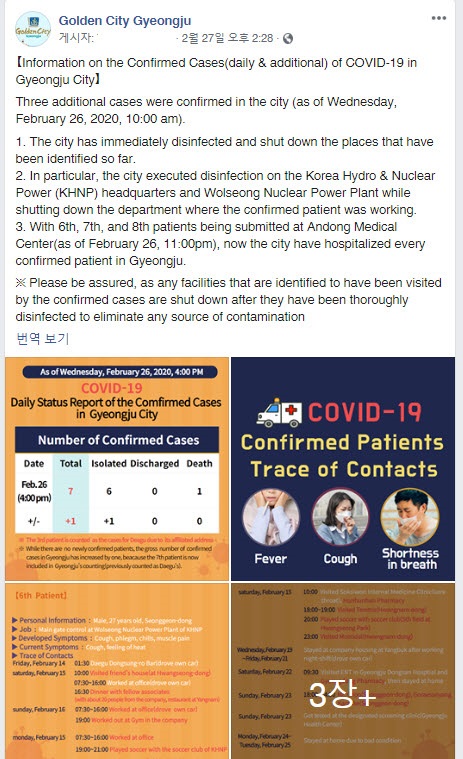 ÇÑÆí ‘Äڷγª19 ÀÏÀÏ ¹ß»ýÇöȲ ¹× È®ÁøÀÚ µ¿¼±’ ¿µ¾î ¼ºñ½º´Â ½Ã ¿µ¹® ÆäÀ̽ººÏ(Golden City Gyeoungju) µî¿¡¼ È®ÀÎÇÒ ¼ö ÀÖ´Ù.