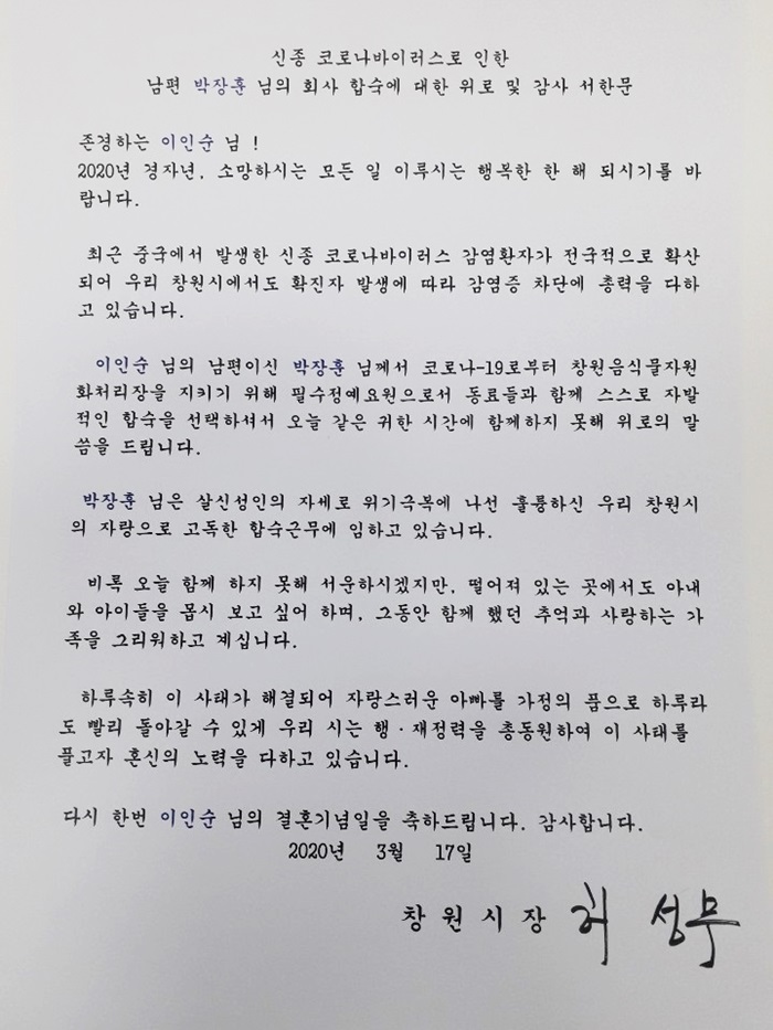 | â¿ø½Ã´Â â¿øÀ½½Ä¹°ÀÚ¿øÈó¸®ÀåÀÇ Çʼö¿ä¿ø 13¸íÀÌ Äڷγª-19 È®»ê¿¡ µû¸¥ Æó±â¹°Ã³¸®½Ã¼³ Á¤»ó°¡µ¿À» »ç¼öÇϱâ À§ÇØ Àü±¹ ÃÖÃÊ·Î ÀÚÁø ÇÕ¼÷À» ÇÑ Áö 3ÁÖ°¿¡ Á¢¾îµé°í ÀÖ´Ù. »çÁøÀº Ç㼺¹« ½ÃÀåÀÌ ¿À´Â 17ÀÏ °áÈ¥ ±â³äÀÏÀ» ¸Â´Â Á÷¿ø °¡Á·¿¡°Ô º¸³¾ ¼Çѹ®. |