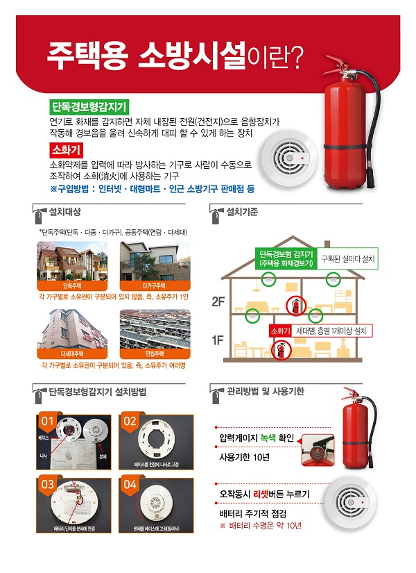 ÁÖÅÃ¿ë ¼Ò¹æ½Ã¼³À̶õ ¼Òȱâ¿Í ´Üµ¶°æº¸Çü°¨Áö±â¸¦ ¸»ÇÑ´Ù. 2017³â 2¿ù 5ÀϺÎÅÍ ‘¼Ò¹æ½Ã¼³¹ý Á¦8Á¶’¿¡ µû¶ó ±âÁ¸ ÁÖÅÃÀ» Æ÷ÇÔÇÏ¿© ¸ðµç ÁÖÅÃÀÇ ¼ÒÀ¯ÀÚ´Â Àǹ«ÀûÀ¸·Î ¼³Ä¡ÇؾßÇÑ´Ù. ¼Òȱâ´Â ¼¼´ëº°, Ãþº° 1°³ ÀÌ»ó, ´Üµ¶°æº¸Çü°¨Áö±â´Â ±¸È¹µÈ ½Ç¸¶´Ù 1°³¾¿ ¼³Ä¡ÇؾßÇÑ´Ù.