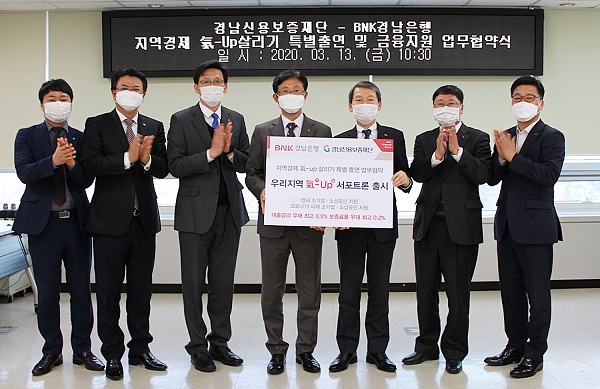 Áö¿ª°æÁ¦ Ѩ-Up »ì¸®±â Ưº°Ã⿬ ¹× ±ÝÀ¶Áö¿ø ¾÷¹« Çù¾à¿¡ µû¶ó BNK°æ³²ÀºÇà°ú °æ³²½Å¿ëº¸ÁõÀç´ÜÀº °æ³²Áö¿ª ¼ÒÀç ¿µ¼¼ ¼Ò±â¾÷¤ý¼Ò»ó°øÀΰú Äڷγª19·Î ÀÎÇØ °æ¿µ¾Ö·Î¸¦ °Þ´Â ¼Ò±â¾÷¤ý¼Ò»ó°øÀο¡°Ô ±ä±ÞÀÚ±ÝÀ» Áö¿øÇϱâ·Î Çß´Ù.